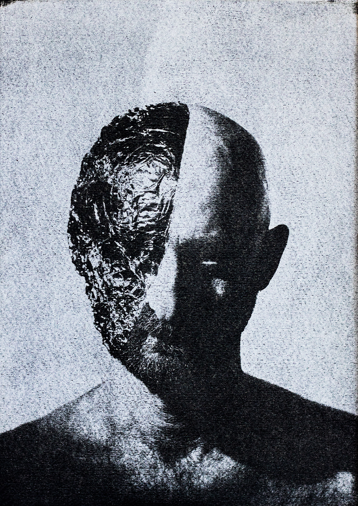 The works in this collection operate on the precipice of the uncanny. The human form is present but consistently altered and placed in distress by internal and external forces. These physical manipulations serve as potent metaphors for psychological fragmentation and masculine vulnerability.